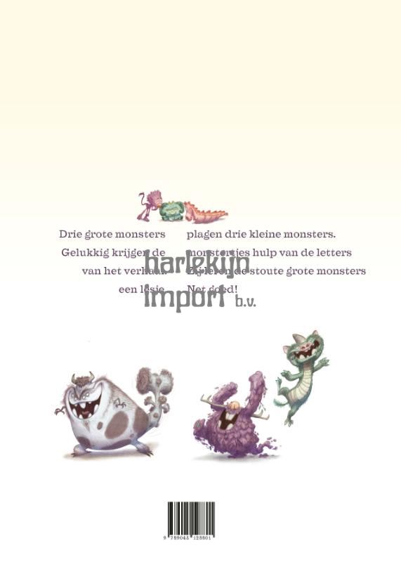 Tjibbe Veldkamp (De fantastische vliegwedstrijd en Maar eerst ving ik een monster) schreef een stoer én grappig monsterverhaal, waar Rachelle Joy Slingerland een prachtig prentenboek van maakte. Drie grote monsters plagen drie kleine monsters. Hulp komt uit onverwachte hoek: van de woorden van het verhaal! Zij zorgen voor een zeer originele wending en plagen op hun beurt de grote monsters. Die weten niet wat ze overkomt. Net goed! ‘Tjibbe Veldkamp bewijst de beste prentenboekenmaker te zijn die we momenteel in Nederland hebben.’ NRC