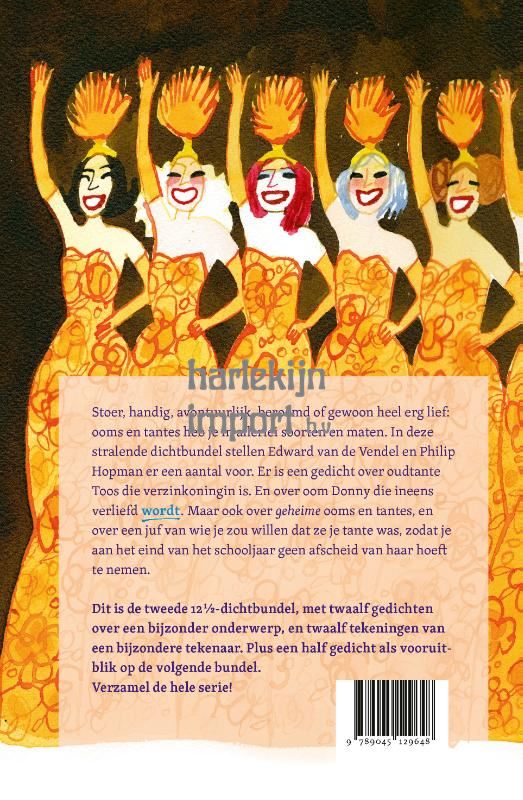 Stoer, handig, avontuurlijk, beroemd of gewoon heel erg lief: ooms en tantes heb je in alle soorten en maten. In deze stralende dichtbundel stellen Edward van de Vendel en Philip Hopman er een aantal voor. Er is een gedicht over oudtante Toos die verzinkoningin is. En over oom Donny die ineens een vriend krijgt. En over groene tante Ava, die plants spreekt met haar handen. Maar ook over geheime ooms en tantes, en over een juf van wie je zou willen dat ze je tante was, zodat je aan het eind van het schooljaar geen afscheid van haar hoeft te nemen. Een fantastische ode aan alle ooms en tantes, met wervelende illustraties van Philip Hopman.
