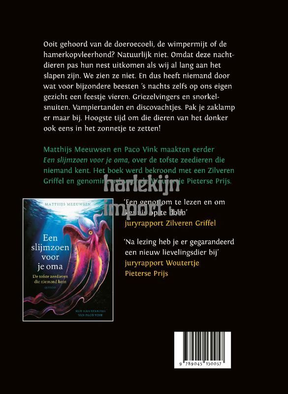 Ooit gehoord van de doeroecoeli, de wimpermijt of de hamerkopvleerhond? Natuurlijk niet. Omdat deze nachtdieren pas hun nest uitkomen als wij al lang aan het slapen zijn. We zien ze niet. En dus heeft niemand door wat voor bijzondere beesten ’s nachts zelfs op ons eigen gezicht een feestje vieren. Griezelvingers en snorkelsnuiten. Vampiertanden en discovachtjes. Pak je zaklamp er maar bij. Hoogste tijd om die dieren van het donker ook eens in het zonnetje te zetten! Met pakkende portretten van de reuzenbekhaai, de colocolo, de goudmol, het waterdwerghert en nog veel meer unieke nachtdieren die iedereen zou moeten kennen.