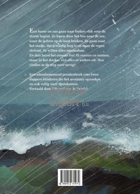 Een broer en zus gaan naar buiten vlak voor de storm begint. Ze voelen de wind toenemen en eenmaal bij de zee zijn de golven al gevaarlijk wild. Maar de kinderen lopen verder, het dorp in. Zelfs als het hard begint te regenen en ze gewaarschuwd worden om naar huis te gaan, gaan ze verder, ze willen alles meemaken. En dan barst het onweer los! Ze rennen en rennen, de kortste weg naar huis. Maar in het donker van de storm ziet alles er anders uit. Hoe vinden ze de weg weer terug? In dit adembenemende prentenboek verbeeldt Sydney Smith de tocht van twee dappere kinderen die het avontuur opzoeken en ook veilig weer thuiskomen. ‘De kracht van de natuur boeit en ontroert in dit fenomenale verhaal over het verleggen van grenzen.’ Kirkus Reviews (starred review)