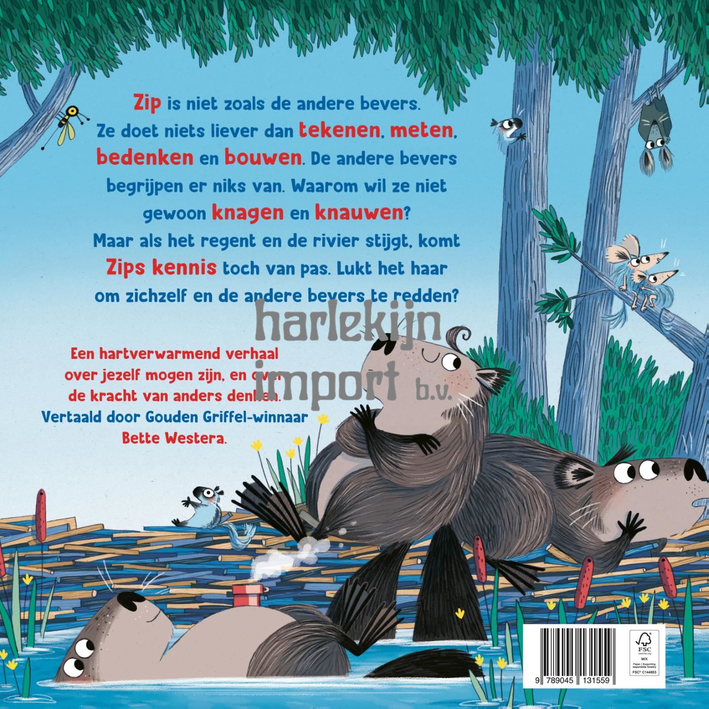 Zip is niet zoals de andere bevers: ze hamert en zaagt liever dan dat ze knauwt en knaagt. De andere bevers vinden het maar gek. Dat is toch niets voor een bever, al dat meten, bedenken en bouwen? Maar dan gaat het regenen. Zip voelt nattigheid, peilt het water en schrikt: het bos overstroomt! Snel haalt ze haar potlood en planken tevoorschijn om de bevers en andere dieren te redden – op haar eigen bevermanier.