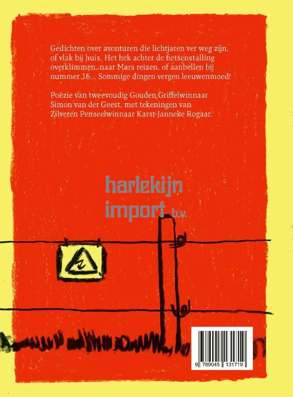 Avontuurlijke gedichten, in het thema van de Kinderboekenweek Een bundel met poëzie over spannende en ook grappige dingen: het hek achter de fietsenstalling overklimmen, een schaap leren scheren, ’s nachts zwemmen in de zee. Gedichten over avonturen die lichtjaren ver weg zijn, of vlak bij huis. Want het vergt moed om aan te bellen bij nummer 16 om je bal terug te vragen. Leeuwenmoed! Net als plassen op schrikdraad of van de hoge springen...