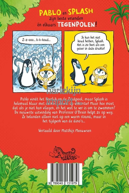 De pinguïns Pablo en Splash zijn beste vrienden én elkaars tegenpolen. Pablo is een huismus en een zorgvuldige planner, Splash is impulsief en altijd op zoek naar avontuur. Als Splash het barre weer op de Zuidpool zat is, haalt ze Pablo over om met haar op vakantie te gaan. Maar in plaats van op de luxe strandbestemming die Splash in gedachten heeft, belanden ze in een tijdmachine die hen terugbrengt naar het tijdperk van de dino’s. Hoe blijven ze uit de klauwen van die hongerige beesten? En hoe komen ze hier weer vandaan? Een vrolijke en grappige graphic novel in kleur, met historische feitjes en tekentips! ‘Onweerstaanbaar grappig.’ The Guardian