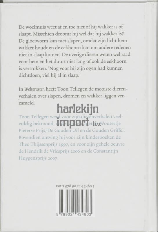 De woelmuis weet af en toe niet of hij wakker is of slaapt. Misschien droomt hij wel dat hij wakker is? De gloeiworm kan niet slapen, omdat zijn licht hem wakker houdt en de eekhoorn kan om andere redenen niet in slaap komen. De overige dieren weten wel raad voor hem en het duurt niet lang of ook de eekhoorn is vertrokken. `Nog voor hij zijn ogen had kunnen dichtdoen, viel hij al in slaap. In Welterusten heeft Toon Tellegen de mooiste dierenverhalen over slapen, dromen en wakker liggen verzameld.