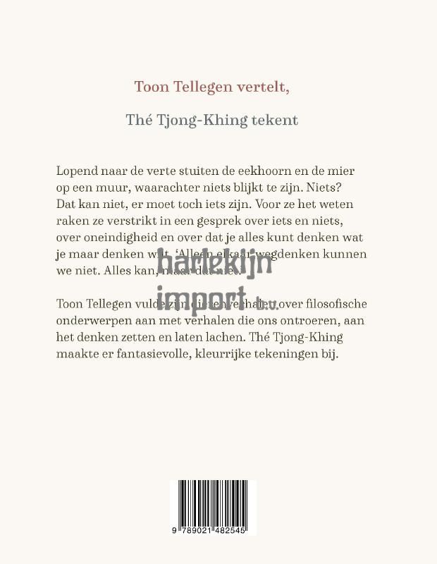 Lopend naar de verte stuiten de eekhoorn en de mier op een muur, waarachter niets blijkt te zijn. Niets? Dat kan niet, er moet toch iets zijn. Voor ze het weten raken ze verstrikt in een gesprek over iets en niets, over oneindigheid en over dat je alles kunt denken wat je maar denken wilt. ‘Alleen elkaar wegdenken kunnen we niet. Alles kan, maar dat niet.’ De dieren bespreken het verstrijken van de tijd, de rol van het toeval en de geest krijgen. De alleswetende mier deelt hen in twee soorten in: dieren die niets weten en dieren die helemáál niets weten. Toon Tellegen vulde zijn dierenverhalen over filosofische onderwerpen aan met nieuwe verhalen, die ons ontroeren, laten lachen en zelf aan het denken zetten. Thé Tjong-Khing versierde het boek met fantasievolle, kleurrijke, paginagrote tekeningen.