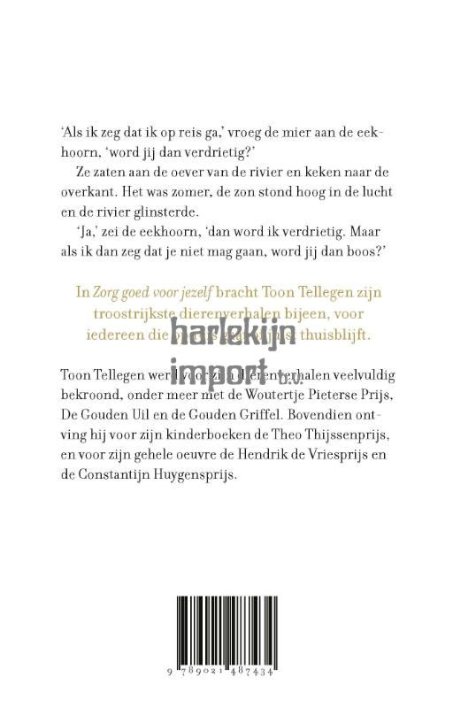 ‘Als ik zeg dat ik op reis ga,’ vroeg de mier aan de eekhoorn, ‘word jij dan verdrietig?’ Ze zaten aan de oever van de rivier en keken naar de overkant. Het was zomer, de zon stond hoog in de lucht en de rivier glinsterde. ‘Ja,’ zei de eekhoorn, ‘dan word ik verdrietig. Maar als ik dan zeg dat je niet mag gaan, word jij dan boos?’ In Zorg goed voor jezelf bracht Toon Tellegen zijn troostrijkste dierenverhalen bijeen, voor iedereen die op reis gaat of juist thuisblijft.