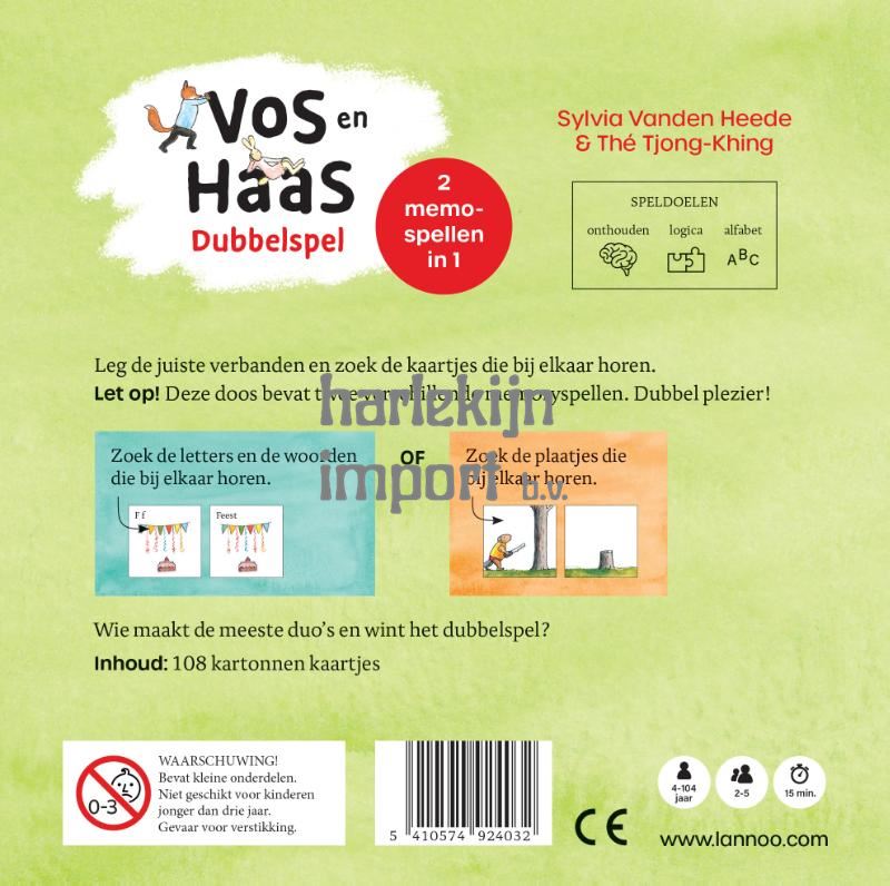 <p>Leg de juiste verbanden en zoek de kaartjes die bij elkaar horen.</p> <p>Let op! Deze doos bevat twee verschillende memoryspellen. Dubbel plezier!</p> <ul> <li>Ofwel zoek je naar de letters en de woorden die bij elkaar horen</li> <li>Ofwel zoek je naar de plaatjes die bij elkaar horen</li> </ul> <p>Wie maakt de meeste duo’s en wint het dubbelspel?</p> <ul> <li>Leeftijd: 4-104 jaar</li> <li>Spelers: 2 tot 5</li> <li>Duur: 15 min.</li> <li>Inhoud: 108 kartonnen kaartjes</li> </ul> <p>Speldoelen: onthouden, logica en alfabet</p>