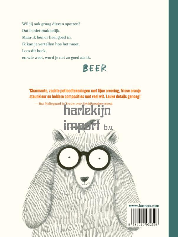 Beer is echt héél goed in dieren spotten. Hij geeft tips zodat jij er net zo goed in kunt worden als hij! Vandaag heeft hij geen geluk, want er valt niets te zien... Maar is dat zo? Misschien zie jij wel veel meer dan Beer. 'Charmante, zachte potloodtekeningen met fijne arcering, frisse oranje steunkleur en heldere composities met veel wit. Leuke details genoeg!' - Bas Maliepaard in Trouw over Een bijzondere vriend 'Meest krachtig aan dit boek is de herhaling en het samenspel tussen de illustraties die bij Warre horen en bij Seppe.' - Kinderboekenrijk.nl over Een bijzondere vriend 'De illustraties zijn fantasierijk, soms grappig en warm qua sfeer.' - Kinderboekenjournaal.nl over Een bijzondere vriend