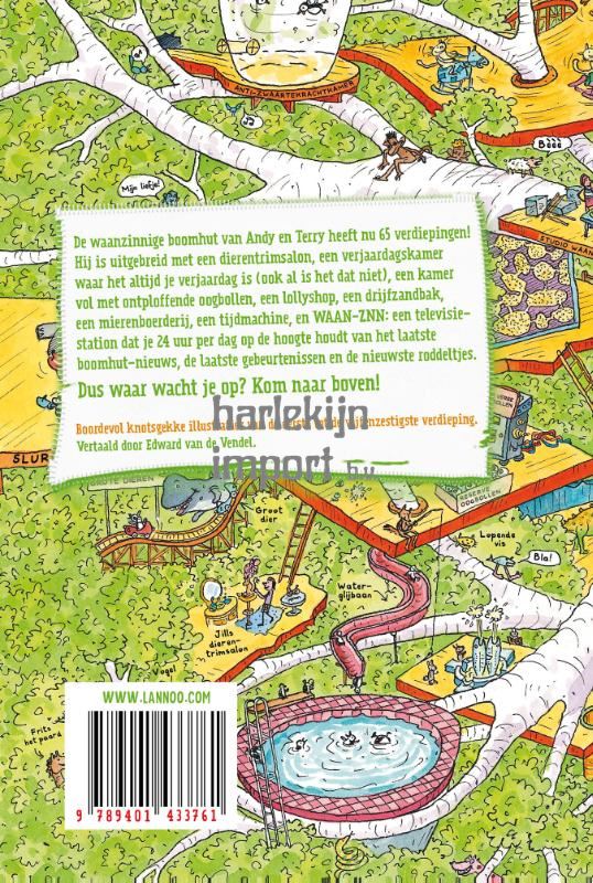 Hilarisch samenspel van gekke tekst en nog gekkere tekeningen De waanzinnige boomhut van Andy en Terry heeft nu 65 verdiepingen! Hij is uitgebreid met een dierentrimsalon, een verjaardagskamer waarin het altijd jouw verjaardag is (ook al is het dat niet), een ruimte vol met ontploffende oogbollen, een lollyshop, een drijfzandbak, een mierenboerderij, een tijdmachine, en WaanCNN: een tv-zender die je 24 uur per dag op de hoogte houdt van de laatste boomhutnieuwsberichten, de laatste plannen en de laatste roddels. Dus waar wacht je nog op? Kom naar boven!