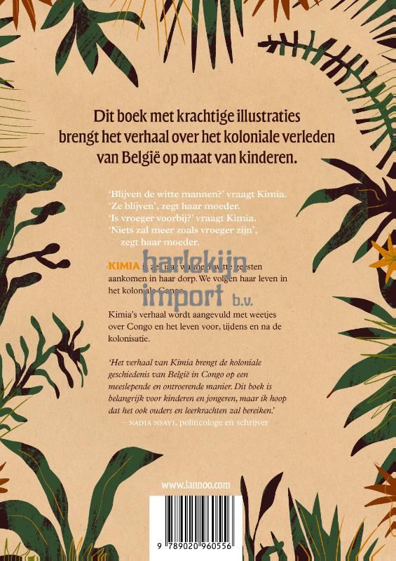 'Wat is er aan de hand?' vraagt Kimia haar mama. 'De witte mannen en de soldaten willen dat we het sap uit de bomen opvangen', zegt haar mama. 'Bloeden de bomen wit?' vraagt Kimia. 'Ja', zegt haar mama. 'Blijven de witte mannen?' vraagt Kimia. 'Ze blijven', zegt haar mama. 'Is vroeger voorbij?' vraagt Kimia. Kimia is zes jaar wanneer witte geesten aankomen in haar dorp. We volgen haar leven in het koloniale Congo en lezen en leven mee met haar verhaal vol verwondering, ellende en voorzichtige hoop. Dit verhaal wordt afgewisseld met informatieve kaarten, illustraties en weetjes over het leven voor, tijdens en na de kolonisatie. In een tijd waarin Belgiƫ zijn koloniale verleden nog steeds verwerkt, helpt dit boek kinderen - en de generaties daarna - om te leren, te begrijpen en samen te bouwen aan een toekomst met meer begrip en inclusie.