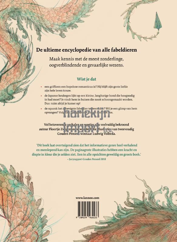 Maak kennis met de meest zonderlinge, oogverblindende en gevaarlijke wezens. Wist je dat een griffioen een hopeloze romanticus is? Hij blijft zijn grote liefde zijn hele leven trouw. de Japanse keukegen lijkt op een kleine, langharige hond die hoognodig in bad moet? Je vindt hem in huizen die nooit schoongemaakt worden. Dus: ruim altijd je kamer op! de squonk het droevigste fabeldier ter wereld is? Wil je een glimp van hem opvangen? Volg dan het spoor van tranen door het bos. Vol betoverende verhalen en weetjes van veelvuldig bekroond auteur Floortje Zwigtman en wonderlijke illustraties van tweevoudig Gouden Penseel-winnaar Ludwig Volbeda. 'Dit boek laat overtuigend zien dat het informatieve genre heel verhalend en meeslepend kan zijn. De paginagrote illustraties hebben een kracht en diepte in kleur die je zelden ziet. Een in alle opzichten geweldig en groots boek.' - Juryrapport Gouden Penseel 2018