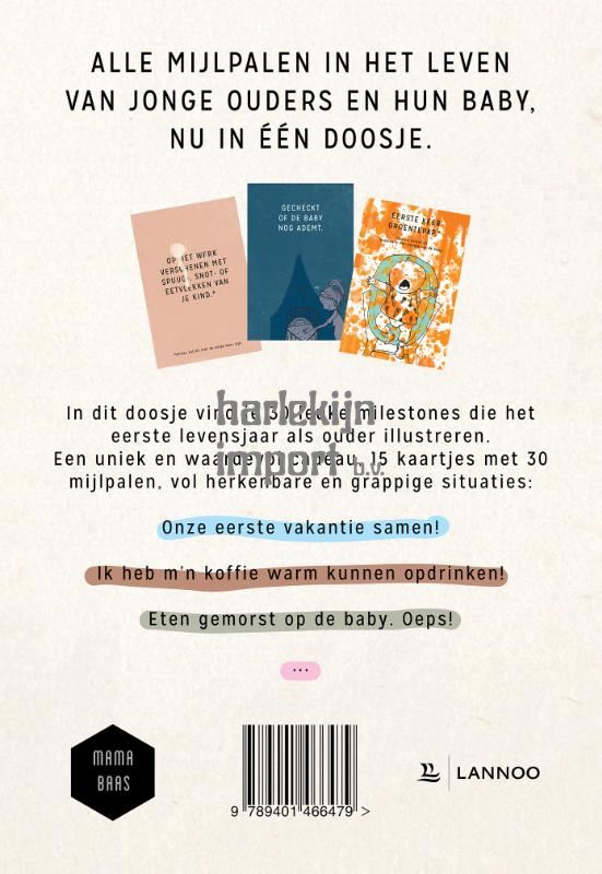 In dit doosje vind je 30 leuke milestones die het eerste levensjaar als ouder illustreren. Een uniek en waardevol cadeau, 15 kaartjes met 30 mijlpalen, vol herkenbare en grappige situaties:Onze eerste vakantie samen!Ik heb m'n koffie warm kunnen opdrinken!Eten gemorst op de baby. Oeps!...