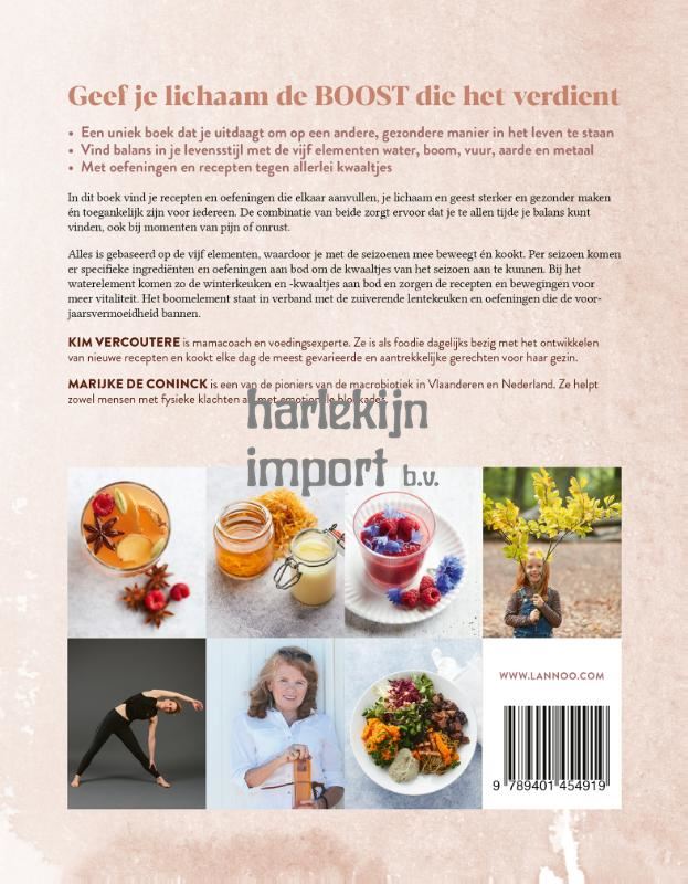 Alles is gebaseerd op de vijf elementen, waardoor je met de seizoenen mee beweegt én kookt. Per seizoen komen er specifieke ingrediënten en oefeningen aan bod om de kwaaltjes van het seizoen aan te kunnen. Zo komen bij het waterelement de winterkeuken en -kwaaltjes aan bod en zorgen de recepten en bewegingen voor meer vitaliteit. Het boomelement staat in verband met de zuiverende lentekeuken en oefeningen die de voorjaarsvermoeidheid wegbannen