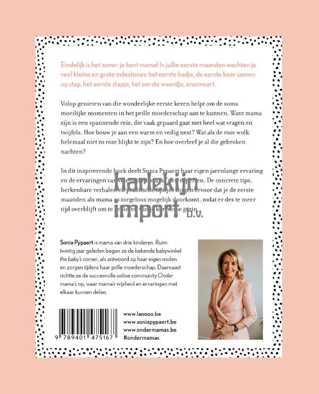 Eindelijk is het zover: je bent mama! Een spannende periode, die vaak gepaard gaat met heel wat onzekerheden en twijfel. Sonia Pypaert, de Tante Kaat van het warme ouderschap, deelt in dit boek haar jarenlange ervaring en steekt kersverse mama's en papa's een hart onder riem. Ze gaat daarbij moeilijke thema's als de (b)roze wolk, gebroken nachten en borst- versus flesvoeding niet uit de weg.
