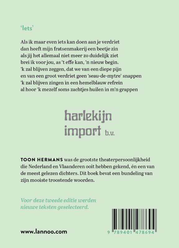 Wat maakte Toon Hermans uniek? Waarom verkozen de lezers van De Telegraaf hem in 1999, een jaar voor zijn dood, tot 'artiest van de eeuw'? Omdat hij hele generaties onbedaarlijk heeft doen lachen en diep ontroerd. Omdat hij het dagelijkse bestaan zo spits en vrolijk wist te relativeren, met pretentieloze grapjes, versjes en liedjes. Omdat hij zo dicht bij ons leek te staan, als een vriend van het huis.