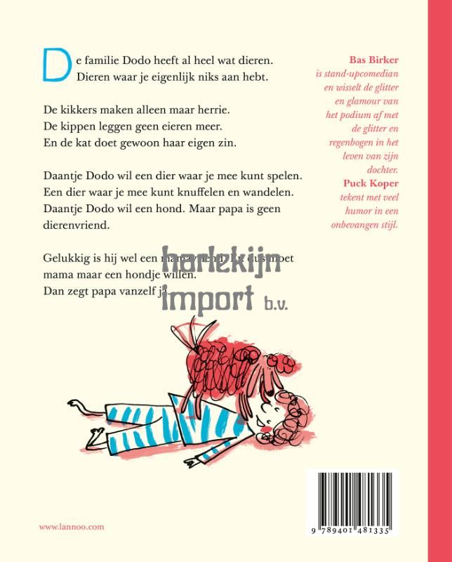 Daantje Dodo wil een dier waar je mee kunt spelen. Een dier waar je mee kunt knuffelen en wandelen. Daantje Dodo wil een hond. Maar papa is geen dierenvriend.