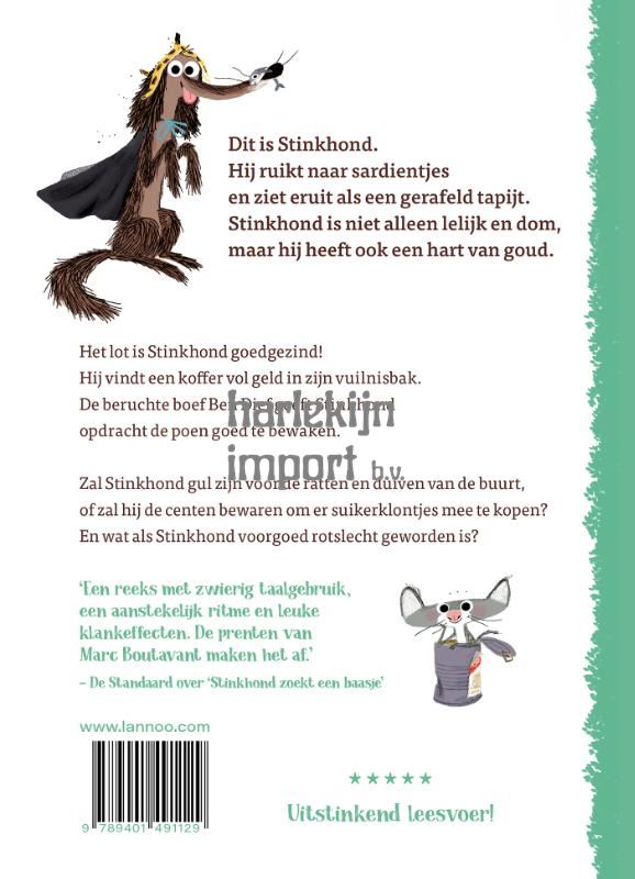 Dit is Stinkhond. Hij ruikt naar sardientjes en ziet eruit als een gerafeld tapijt. Stinkhond is niet alleen lelijk en dom, maar hij heeft ook een hart van goud. Het lot is Stinkhond goedgezind! Hij vindt een koffer vol geld in zijn vuilnisbak. De beruchte boef Ben Dief geeft Stinkhond opdracht de poen goed te bewaken. Zal Stinkhond gul zijn voor de ratten en duiven van de buurt, of zal hij de centen bewaren om er suikerklontjes mee te kopen? En wat als Stinkhond voorgoed rotslecht geworden is?