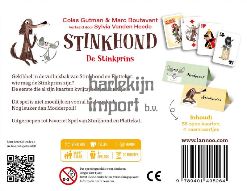 Gekibbel in de vuilnisbak van Stinkhond en Plattekat: wie mag de Stinkprins zijn? De eerste die al zijn kaarten kwijtspeelt, natuurlijk! Dit spel is niet moeilijk en vooral heel erg leuk. Nog leuker dan Modderpoli! Met originele speelkaarten, grappige naamkaartjes en duidelijke speluitleg. Extra toegankelijk door de QR-code op de speldoos: die leidt naar een filmpje over hoe het spel gespeeld wordt. Voor spelers van 6 tot 106 jaar