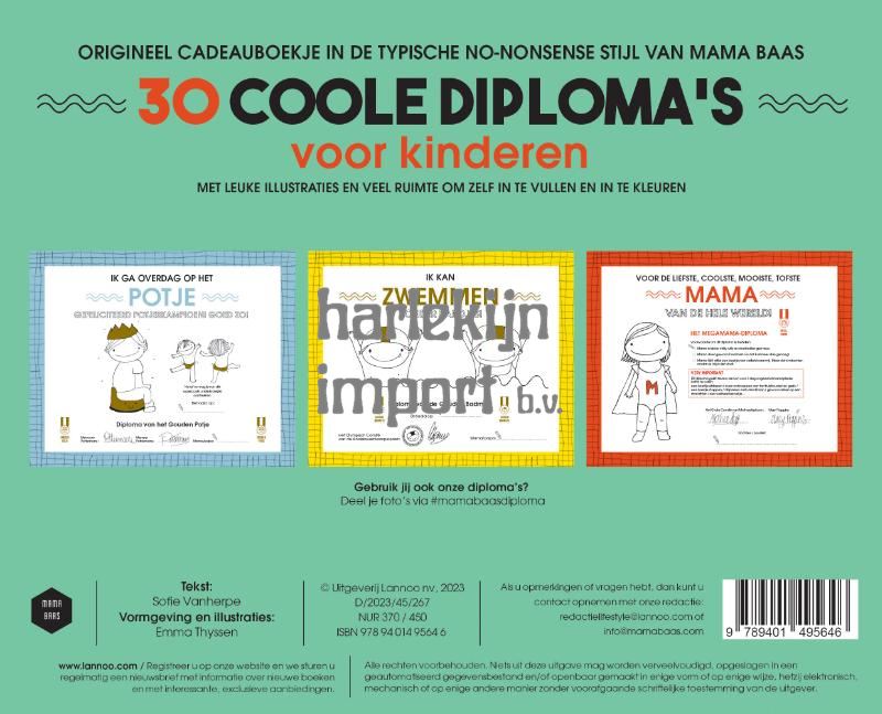 Een diploma halen als tweejarige is enkel voor hoogbegaafde kinderen, zeg je? Wij dachten het niet! In Het Grote Diplomaboek ontdek je 28 prachtig geïllustreerde en uit het leven gegrepen diploma's voor jouw kroost. Het boek biedt leuke herinneringen en een extra stimulans voor het bereiken van de moeilijkste mijlpalen. Je kunt de diploma's gemakkelijk uitscheuren om in te kaderen en/of op te hangen. Eerste keer op het potje? Geen fopspeen meer nodig? De tandjes mooi gepoetst? Dat verdient allemaal een diploma-uitreiking! Laat je kleine peuter of kleuter zelf zijn diploma inkleuren, noteer data of tel mee hoe vaak je kind een bepaalde doelstelling behaalt.