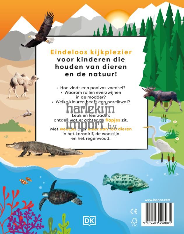 Hoe vindt een poolvos voedsel? Waarom rollen everzwijnen in de modder? Welke kleuren heeft een parelkwal? Leuk en leerzaam: ontdek wat er achter de flapjes zit. Met weetjes over meer dan 100 dieren in het koraalrif, de woestijn en het regenwoud.