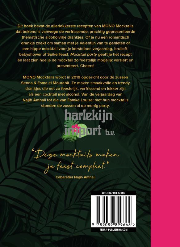 Dit boek bevat de allerlekkerste recepten van MONO Mocktails dat bekend is vanwege de verfrissende, prachtig gepresenteerde thematische alcoholvrije drankjes. Of je nu een romantisch drankje zoekt om samen met je Valentijn van te genieten of een hippe mocktail voor je kerstdiner, verjaardag, bruiloft, babyshower of Suikerfeest: 'Mocktail party' geeft je het recept én laat zien hoe je de mocktail zo feestelijk mogelijk versiert en presenteert. Cheers! 'Deze mocktails maken je feest compleet!' - Cabaretier Najib Amhali 'De mocktails van MONO Mocktails smaken heerlijk en zien er prachtig uit.' - Voetbalbroers Amrabat 'Ik heb heel de avond worry free aan de mocktails kunnen zitten! En gelukkig was ik de volgende dag weer fit om een show te zingen.' - Zangeres Emma Heesters 'MONO Mocktails leveren boven verwachting van een klant. Ze maken heel smaakvolle en diverse kleurrijke mocktails. Al twee keer MONO Mocktails geboekt, en twee keer fantastisch werk geleverd.' - Voetballer Zakaria Labyad