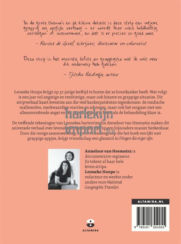 ‘Dingen die erger zijn’ is een bijzonder en aangrijpend stripverhaal voor volwassenen over borstkanker. Lenneke Hoope was 37 jaar toen ze onder de douche een knobbeltje in haar borst voelde. Toen ze de diagnose borstkanker kreeg volgde een jaar vol angstige, verdrietige, maar ook bizarre en grappige situaties. In dit stripverhaal lees je over haar ervaringen als borstkankerpatiënt: de chemo’s in het ziekenhuis, de merkwaardige reacties en adviezen uit haar omgeving, het ziek en uitgeblust op de bank liggen en het omgaan met een constant allesomvattende angst. De treffende tekeningen van Lennekes hartsvriendin Anneloor van Heemstra maken dit universele verhaal over ziek zijn op een bijzondere manier herkenbaar voor iedereen. Speciaal bedoeld voor vrouwen die zelf borstkanker hebben (gehad), of voor naasten en dierbaren.