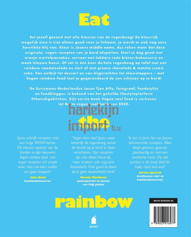 Na het succes van ‘Vegan soul food’ én ‘Vegan party food’ is Jason Tjon Affo terug met ‘Vegan rainbow food’. In dit kleurrijke vegan kookboek leer je gezond te koken met alle kleuren van de regenboog. Door verschillende ingrediënten te gebruiken die allemaal van nature een andere kleur hebben, laat Jason zien hoe je zoveel mogelijk voedzame voedingsstoffen binnenkrijgt, en dat in één gerecht. Zo wordt jouw vegan maaltijd niet alleen voedzaam, maar ook superlekker. Van de ultieme rainbow sushibowl tot een overheerlijke matchacake: elk recept laat gegarandeerd de zon schijnen op je bord. ‘Vegan rainbow food’ is daarom een onmisbaar kookboek voor iedereen die overheerlijk en kleurrijk vegan eten wil ontdekken. Jason Tjon Affo staat bekend om zijn unieke en kleurrijke recepten en fotografie, die hij toont op zijn blog en Instagram ‘The Indigo Kitchen’. ‘Vegan soul food’ werd bekroond tot het beste vegan kookboek van het jaar 2020 door LekkerVega. ‘Vegan rainbow food’ is zijn derde boek.