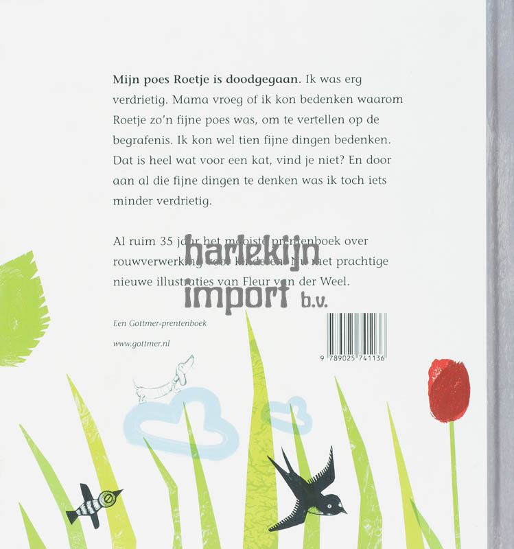 Nieuwe uitgave (12de druk!) van het ontroerende verhaal over poes Roetje, die dood is gegaan en begraven moet worden. Samen met zijn moeder verzint de hoofdpersoon tien dingen waarom Roetje zo'n fijne poes is geweest. Tien dingen, dat is heel wat voor een kat!