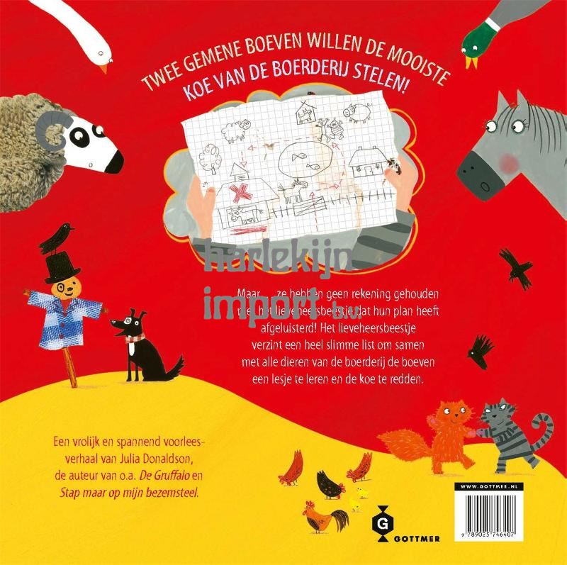 Twee boeven zijn ’s nachts van plan de prijskoe van de boerderij te stelen. Ze worden echter afgeluisterd door het lieveheersbeestje, dat een slimme tegenaanval bedenkt: elk dier doet het geluid van een ander dier op de boerderij na. Zo raken de boeven in het pikdonker in de war en in plaats van de koeienstal lopen ze de vijver in. Dit is het ideale boek om keer op keer voor te lezen. Kleuters zullen steeds beter snappen hoe slim het plan van het lieveheersbeestje is en waar en hoe de boeven precies om de tuin, of liever gezegd om de stal, worden geleid.