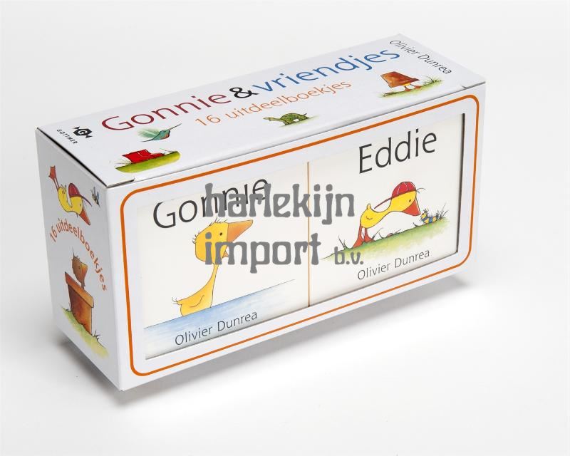 Sinds Gonnie en Gijsje zes jaar geleden de Nederlandse boekwinkels binnenwaggelden, zijn deze gansjes en hun vriendjes razend populair bij peuters. Hoog tijd dus om alle vriendjes en vriendinnetjes mee te laten genieten van hun avonturen. In de doos zitten 16 miniboekjes (4 x 4 verschillende titels) om uit te delen op een verjaardag of bij het afscheid nemen van de peutergroep, of om zomaar weg te geven omdat je iemand aardig vindt.