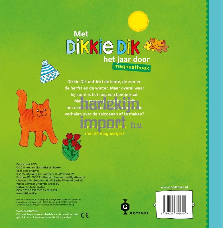 'Met Dikkie Dik het jaar door' is het eerste magneetboek van Dikkie Dik. Ontdek de vier seizoenen met Dikkie Dik en zijn vriendjes! Magneetboek over de seizoenen Dikkie Dik en zijn vriendjes ontdekken de vier seizoenen. Op de prachtig geïllustreerde magnetische bladzijden kunnen kinderen met de magneetjes hun eigen Dikkie Dik-verhaal bedenken: in de lente, de zomer, de herfst en de winter. Met 24 gekleurde magneten en een handig hersluitbaar opbergvak. Om lekker samen te lezen - en te spelen!