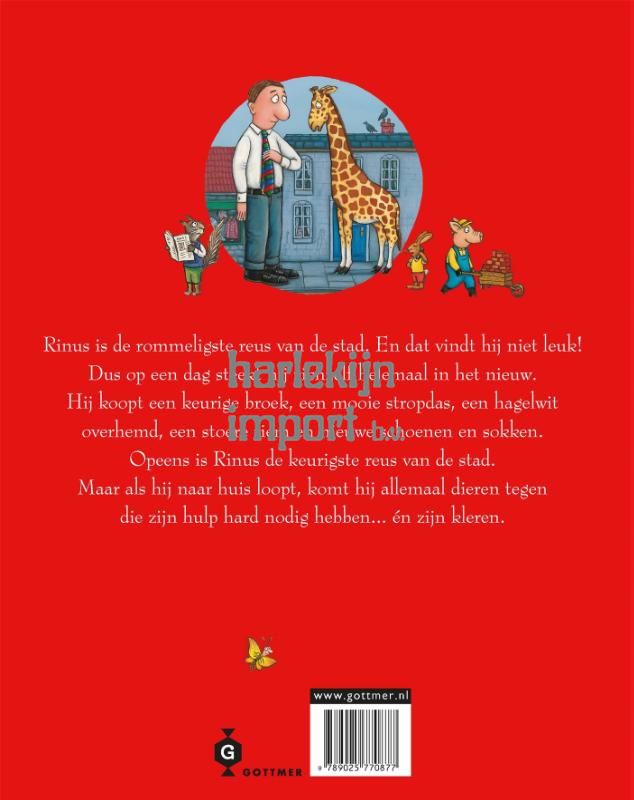 Rinus draagt altijd hetzelfde oude kloffie en wordt dan ook met recht de rommeligste reus van de stad genoemd. Maar op een dag heeft hij er genoeg van, en hij steekt zichzelf helemaal in het nieuw: een keurig overhemd, een keurige broek, een keurige riem, een keurige das, twee keurige sokken met ruitjes opzij, en een paar keurig gepoetste schoenen. Rinus is nu de keurigste reus van de stad. Zijn oude kleren laat hij in de winkel achter. Maar onderweg naar huis komt Rinus allerlei hulpbehoevende dieren tegen, en voor hij er erg in heeft, heeft hij al zijn nieuwe kleren weggegeven. Rinus is niet langer keurig, maar koud! Gelukkig vindt hij zijn oude kleren terug in een vuilniszak en dolgelukkig danst hij naar huis. Bij thuiskomst staat Rinus een verrassing te wachten. Zijn vrienden hebben een kroon van goudpapier voor hem gemaakt. Julia Donaldson en Axel Scheffler vormen samen het populairste prentenboekenduo van Groot-Brittannië. Het beroemdste boek dat ze samen maakten is 'De Gruffalo', maar ze maakten er nog héél veel meer - de een nog leuker dan de ander. Ontdek ze allemaal!