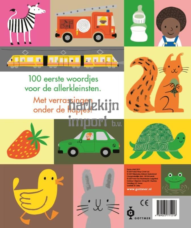 Een mooi geïllustreerd eerstewoordjesboek met flappen van Edward Underwood – met 100 woorden uit de wereld van de allerkleinsten. Eerste woordjes In 100 eerste woordjes van Edward Underwood maken dreumesen kennis met 100 eerste woordjes en hun bijbehorende illustraties. Alle woorden zijn ingedeeld per thema, variërend van boerderij tot buiten spelen en van voertuigen tot slapengaan. Als extraatje is op elke pagina nóg een woord verstopt achter een stevige flap. Een groot en stijlvol designboek vol woorden uit de wereld van beginnende praatjesmakers.