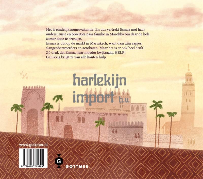 De zomervakantie is aangebroken en dat betekent dat Esmaa op reis gaat! Met haar vader, moeder, broertje en zusje vertrekt ze naar familie in Marokka om daar de zomer door te brengen. Mee in de koffer gaat: pindakaas, chocopasta en een heleboel kleren. Aan het eind van de vakantie zijn de koffers weer vol met: oranjebloesemolie, sabon beldi en allemaal lekkere kruiden voor thuis. Alleen de saffraan ontbreekt nog, dus Esmaa racet met haar moeder naar de markt. In alle drukte raken ze elkaar kwijt. Hoe vinden ze elkaar terug? Er zijn zoveel vrouwen met paarse djellaba's aan! Gelukkig krijgt Esmaa hulp van een waarzegster, watermannetje, acrobaten en een aapje.