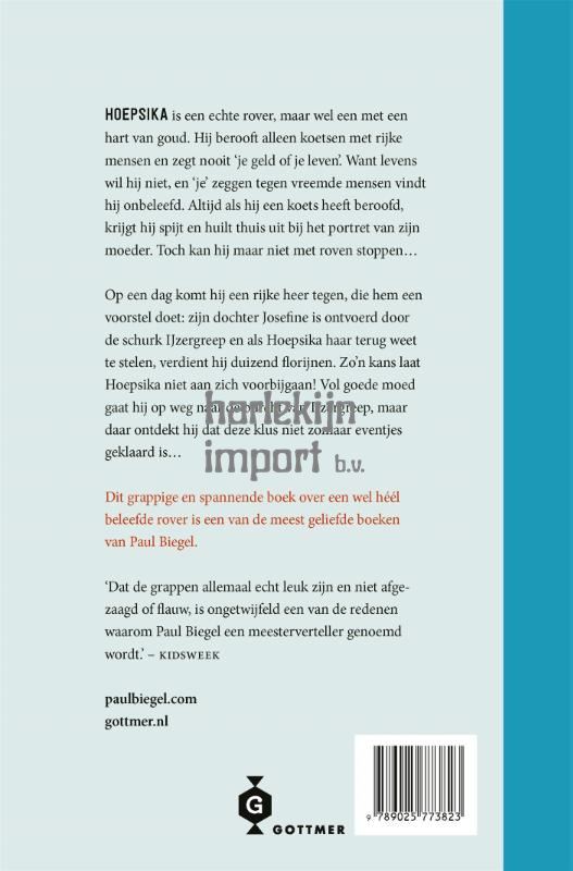 De rover Hoepsika is geen gewone bandiet. Hij rooft alleen van de rijken en is goed opgevoed door zijn geliefde moeder. Elke dag heeft hij vreselijk spijt van zijn wandaden, maar stoppen met roven, dat kan hij niet. Dan ontmoet hij op een dag een rijke heer, die graag gebruik wil maken van de talenten van de rover Hoepsika. Zijn dochter Josefine is in handen gevallen van de schurk IJzergreep. De rover Hoepsika moet haar bevrijden, maar dat is zo makkelijk nog niet… Paul Biegel is de meesterverteller van de Lage Landen, een van de meest geliefde stemmen in de Nederlandse jeugdliteratuur. Voor zijn werk kon hij onder andere twee Gouden Griffels en vier Zilveren Griffels in ontvangst nemen. Ook deze kinderklassieker van Paul Biegel is heerlijk voor het voorlezen, of natuurlijk om zelf te lezen. De illustraties van Carl Hollander zijn al even herkenbaar, en grote platen zijn speciaal voor deze editie ingekleurd.