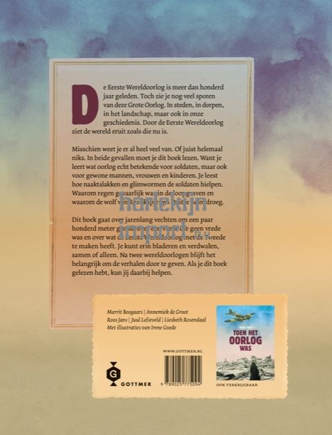 ‘Toen het oorlog was, 1914-1918’ is een prachtig verzorgd non fictie-kinderboek over de Eerste Wereldoorlog. Dit informatieve boek heeft oog voor het internationale verloop van de oorlog, maar vooral ook voor de situatie in Nederland en België. Een prachtige uitgave vol historische fotografie en fullcolour-illustraties. Auteurs Annemiek de Groot, Roos Jans, Juul Lelieveld, Liesbeth Rosendaal en Marrit Boogaars van tekstbureau Patsboem! educatief weten als geen ander de geschiedenis op een begrijpelijke en informatieve manier uit te leggen voor kinderen in de bovenbouw van de basisschool. Voor het eerder verschenen ‘Toen het oorlog was, 1939-1945’, dat over de Tweede Wereldoorlog gaat, won het team van Patsboem! educatief een Zilveren Griffel. ‘Toen het oorlog was, 1914-1918’ is encyclopedisch opgezet en heeft thematische hoofdstukken, bijvoorbeeld over het ontstaan van de oorlog, de belangrijkste gevechten en het leven aan het front. Illustrator Irene Goede maakte de sfeervolle illustraties, die de soms indringende tekst verluchtigen en een extra dimensie geven aan de historische fotografie.