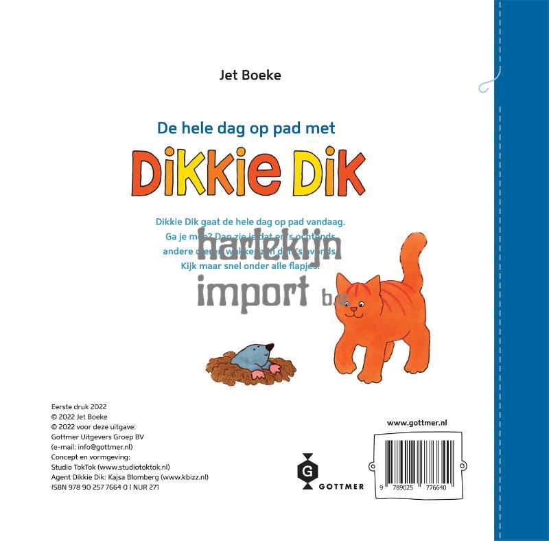 Dit stevige kartonboek over de geliefde rode kater Dikkie Dik, 'De hele dag op pad met Dikkie Dik', gaat over dag en nacht en over alle dieren en dingen die je tegen kunt komen. Op elke pagina vind je grote flappen om nog meer van de wereld van Dikkie Dik achter te ontdekken.