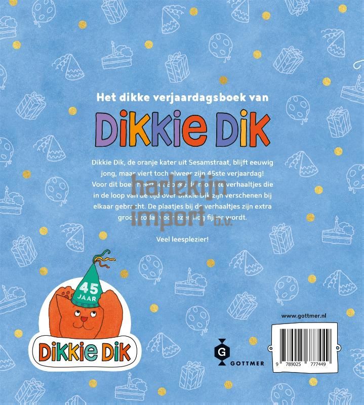 In 2023 bestaat Dikkie Dik alweer 45 jaar! In dit feestjaar steken we de everseller 'Het dikke verjaardagsboek van Dikkie Dik' in een spectaculair nieuw jasje: een prachtig nieuw omslag ter ere van het jubileum. Want hoe kun je de verjaardag van Dikkie Dik beter vieren dan met een spetterende heruitgave van de populairste klassieker over de dikke oranje kater? Het enorme boek bevat maar liefst dertig Dikkie Dik-verhaaltjes, over de avonturen van een typische huiskat. Lees wat Dikkie Dik allemaal beleeft met muizen, kattenbrokjes, zijn vriendjes, Beer, honden, bollen wol en... een verjaardagstaart. Achter in het dikke prentenboek zit een persoonlijk woord van Jet Boeke. De grote platen maken het boek een feest om cadeau te geven, voor te lezen en door te bladeren.