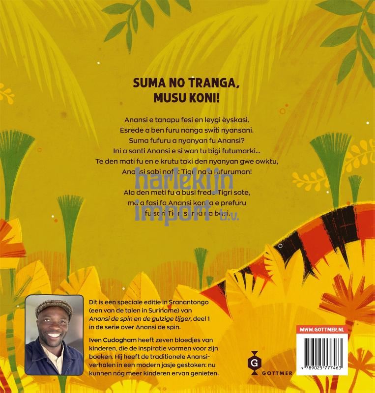 Maak kennis met de slimme Anansi en zijn vrienden in het prentenboek 'Anansi de spin en de gulzige tijger', nu in het Surinaams! Het eerste verhaal in de reeks van Iven Cudogham is vanaf nu ook in het Sranantongo te lezen. De slimme Anansi, bekend uit tal van West-Afrikaanse, Surinaamse en Caribische volksverhalen, zet zoals altijd weer eens een veel groter en sterker dier op zijn nummer!