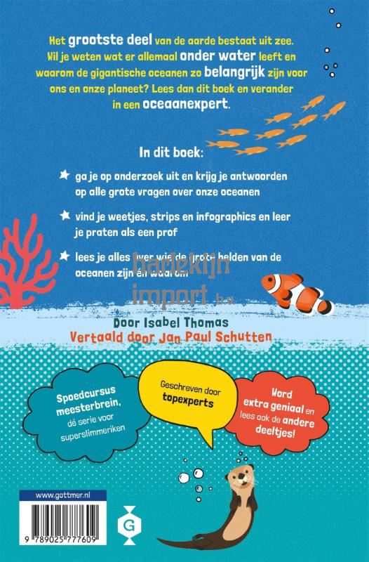 In dit deel van de superslimme serie 'Spoedcursus meesterbrein' leer je alles wat je wilt weten over de zeeën op aarde. Het grootste deel van de aarde bestaat uit zee. Onze onmetelijk grote oceanen zijn mysterieuze plekken vol raadsels. Wist je bijvoorbeeld dat ongeveer twee derde van de diersoorten die in de oceanen leven nog niet ontdekt is? Wil je de raadsels van de zee ontrafelen en weten wat er allemaal onder water leeft? En waarom de gigantische oceanen zo belangrijk zijn voor ons en onze planeet? Lees dan dit boek en verander in een oceaanexpert. In dit boek vind je weetjes, strips en infographics en leer je praten als een prof. Lees alles over wie de grote helden van de oceanen zijn én waarom, en krijg antwoord op alle grote vragen over de oceanen. Duik in de 'Spoedcursus meesterbrein'-serie en word in no time een topexpert over van alles en nog wat. Deze superinformatieve en kleurrijk geïllustreerde serie is geschreven door gerenommeerde non-fictieauteurs, meegelezen door absolute helden in elk vakgebied en vertaald door een aantal van de beste non-fictieauteurs van Nederland. Vergroot je kennis, vocabulaire en begrip van onderwerpen als het klimaat, het universum, robots en artificiële intelligentie en oceanen.