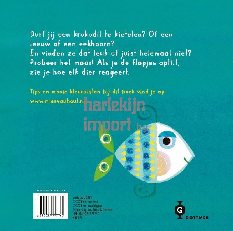 Heb je weleens een beer gekieteld? Of een krokodil? Nee? Probeer het maar in 'Ga je mij kietelen?'! Dit kartonboek met grote flappen laat dreumesen en peuters een kietelspelletje spelen met kleine en grote dieren, de liefste en de gevaarlijkste bewoners van het beestenrijk. En kijk dan snel onder de flap om te zien hoe de verschillende dieren reageren op kietelen. Kietelen is een favoriet spelletje tussen kinderen en hun ouders. Het zorgt voor veel plezier en mondt niet zelden uit in een dikke knuffel. Mies van Hout laat negen prachtige dieren de lezer aankijken, met een blik die boekdelen spreekt over hun reactie op het gekietel.