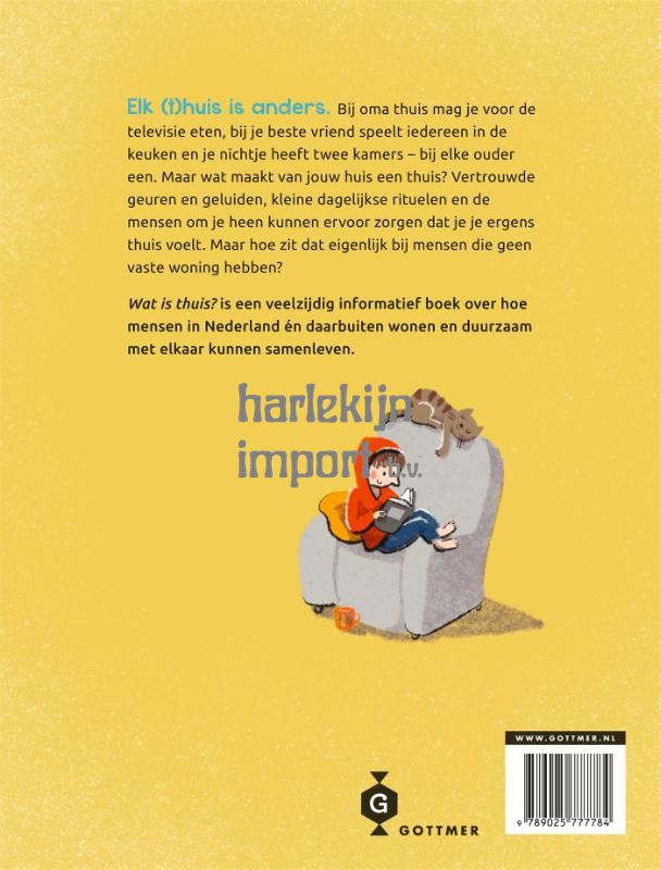 'Wat is thuis?' is een uniek non-fictieboek over wonen en leven in een samenleving, over thuissituaties die van elkaar verschillen of juist op elkaar lijken en hoe wonen werkt in Nederland. Ieder kind weet: elk (t)huis is anders. Bij oma mag je op de bank eten, bij je beste vriend speelt iedereen in de keuken en je nichtje heeft twee kamers - eentje bij haar moeder en eentje bij haar vader. Maar hoe gaat dat bij mensen die geen dak boven hun hoofd hebben? Of bij mensen die met heel veel anderen of juist helemaal alleen wonen? Het leerzame 'Wat is thuis?' zit vol actuele informatie over woonsituaties en leefomstandigheden in Nederland, maar benadert het begrip 'thuis' ook vanuit een meer filosofische invalshoek. Het zet jong en oud aan het denken over wat 'thuis' betekent en over hoe we in onze samenleving zo solidair en duurzaam mogelijk kunnen samenleven. Een onmisbare titel voor de Kinderboekenweek van 2023!
