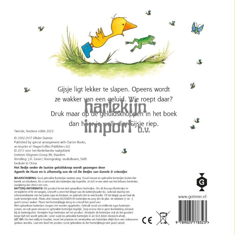 'Gonnie zegt... gak!' is een speciaal geluidenboek voor peuters over de lieve gansjes Gonnie en Gijsje. Met levensechte geluiden van dieren op de boerderij én een leuk liedje. Gijsje ligt lekker te slapen als ze opeens wakker wordt van een geluid. Wie roept daar? Gijsje gaat op onderzoek uit en vraagt alle dieren die ze tegenkomt of zij misschien riepen. Maar geen enkel dier maakt het geluid dat Gijsje hoorde. Weet Gonnie het misschien? 'Gonnie zegt... gak!' heeft stevige kartonnen pagina's en geluidsknoppen in het boek met zeven geluiden: zes dierengeluiden van de boerderij én het leuke liedje 'Gonnie en Gijsje' van Ageeth de Haan. Samen lezen was nog nooit zo leuk! Voor kinderen vanaf 2 jaar. Gonnie en haar vriendjes zijn al meer dan 15 jaar favoriet bij Nederlandse en Vlaamse peuters. De populaire serie van Olivier Dunrea is namelijk niet alleen leuk, maar ook nog eens leerzaam. Een gouden combinatie voor peuters!