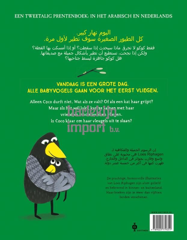 Arabischsprekende lezers en voorlezers kunnen ook genieten van het geliefde verhaal van de kleine Coco, dankzij het tweetalige boekje: 'Coco kan het!' / 'Kûkû taqdar!'. Deze bijzondere tweetalige prentenboeken zijn ook beschikbaar in het Nederlands-Pools, Nederlands-Turks en Nederlands-Engels en dragen bij aan de (voor)leesbevordering. De tweetalige versie van 'Coco kan het!' biedt een speelse manier voor nieuwsgierige peuters om zowel in hun moedertaal als in het Nederlands hun woordenschat uit te breiden. Door de tweetalige aanpak wordt ruimte geboden voor en erkenning gegeven aan de eigen taal van ouders, grootouders en kinderen, wat de leesmotivatie en de ontwikkeling van leesvaardigheden bevordert. Deze boekjes overbruggen het verschil tussen ouders en verzorgers die graag willen voorlezen, maar dat niet doen omdat ze het Nederlands (nog) niet voldoende beheersen. Ontdek nu de tweetalige avonturen van Coco en vergroot spelenderwijs de taalkennis van jouw kleintje! 'Coco kan het!' van Loes Riphagen is een prachtverhaal over moed verzamelen en meer kunnen dan je denkt, voor kinderen vanaf 3 jaar. Voor de kleine Coco is het tijd om haar vleugeltjes uit te slaan. Alle andere babyvogeltjes zijn al uitgevlogen, maar voor Coco is dat zo makkelijk nog niet. Wat nou als ze heel hard valt? Gelukkig heeft Coco een wijze moeder die haar precies het zetje geeft dat ze nodig heeft. Ontdek ook de andere betoverende kinderboeken van de veelgeprezen prentenboekenmaker Loes Riphagen en laat je inspireren door haar unieke verhalen en prachtige illustraties, zoals: 'Het Kabouterboek', 'Kom mee, Kees', 'Het bos van Coco', 'Coco, kijk uit!' en 'Coco en het gekke ding'.