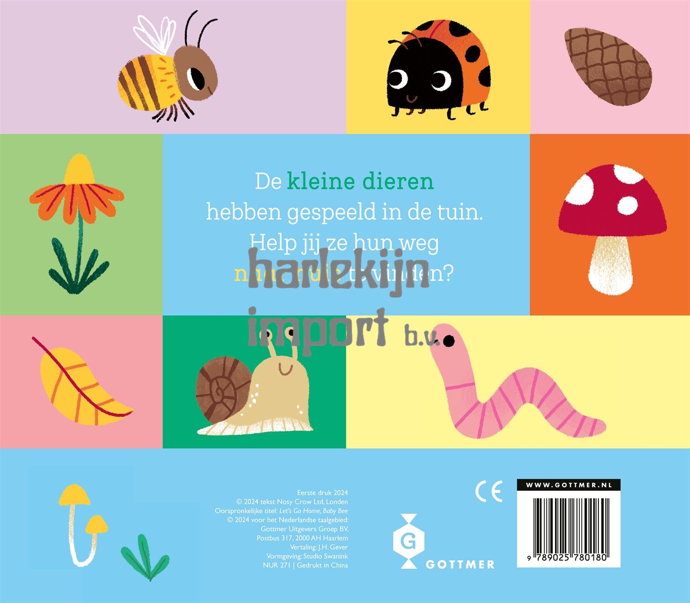 Help vier babydieren de weg naar huis te vinden in het peuterboek 'Kom je thuis, kleine bij?'. Peuters kunnen zelf de paden volgen met behulp van de schuifjes. Zo begeleiden ze de bij, het lieveheersbeestje, de slak en de worm terug naar hun huis. Dit speelse prentenboek stimuleert met de schuifjes de hand-oogcoördinatie en fijne motoriek van dreumesen en peuters. De eerste woordjes en begrippen sluiten aan bij de belevingswereld van jonge kinderen. Door de illustraties aan te wijzen en de woordjes te benoemen, wordt de woordenschat spelenderwijs vergroot. Illustrator en animator Carolina Búzio brengt met meer dan tien jaar ervaring in grafisch ontwerp een unieke sfeer en emotie in haar illustraties. Haar werk, bekend om zijn originaliteit, maakt van dit boek een visueel feestje voor kleine kindjes. De boekjes in de 'Kom je thuis?'-serie zijn leuk voor kinderen vanaf 18 maanden.
