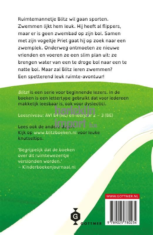 'Blitz! 9 - Zwemmen in de ruimte' (AVI E4, vanaf 7 of 8 jaar) is het negende deel in de leukste AVI-serie voor beginnende lezers! Rian Visser heeft met 'Blitz! ' een serie neergezet die enorm tot de verbeelding spreekt en ervoor zorgt dat kinderen met veel plezier zullen leren lezen. Haar verhalen zijn spannend en toegankelijk, maar zetten ook aan tot nadenken. De grappige illustraties van Lars Deltrap wekken het Blitz-universum op weergaloze wijze tot leven. In 'Zwemmen in de ruimte' besluit Blitz wat meer te gaan bewegen en zwemmen lijkt hem wel wat. Maar helaas: zijn bol is te klein voor een zwembad. Samen met zijn trouwe vriendje Priet begint hij aan een vrolijk ruimteavontuur op zoek naar een geschikte zwemplek. Onderweg ontmoeten ze nieuwe vrienden en bedenkt Priet een slim plan om water naar een andere bol te brengen. Het hoogtepunt? Een frisse duik in het grote zwembad op de bol van Oel en Waps! De AVI-boeken over het ruimtewezen Blitz van Rian Visser en Lars Deltrap zijn mateloos populair bij beginnende lezers en ze zijn goed toegankelijk voor lezers met dyslexie. Ook in 'Blitz! 9 - Zwemmen in de ruimte' is een lettertype gebruikt dat voor iedereen makkelijk leesbaar is. Zo kan iedereen zelf lezen over de wereld vol raketten, ruimtewezens en ufo's. Dit leesboek is geschreven op gecertificeerd AVI-niveau voor lezers in groep 4 en geschikt voor lezers vanaf 7 of 8 jaar.