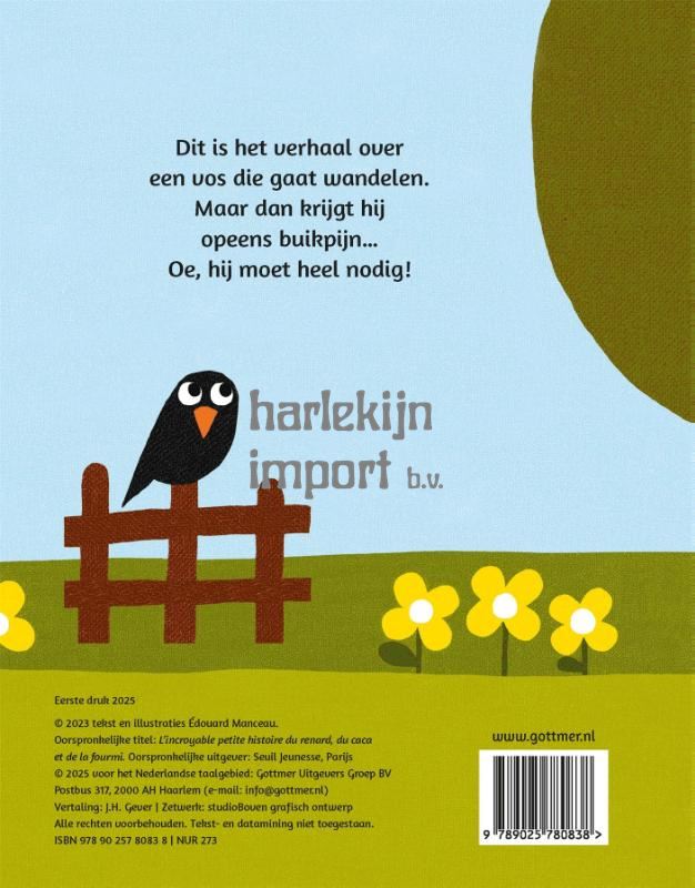 'De vos en de drol' is een onweerstaanbaar droogkomisch boek voor peuters die in de plas- en poepfase zitten. In het prentenboek neemt Vos even lekker pauze tijdens zijn dagelijkse wandeling. De natuur roept, dus hij doet snel zijn behoefte achter een boom - zoals vossen dat doen. Maar dan gebeurt er iets heel vreemds: zijn drol komt doodleuk achter de boom vandaan gewandeld en begint hem achterna te zitten! Vos rent voor zijn leven en gelukkig krijgt hij hulp van zijn vriend Wasbeer. Samen proberen ze aan de kak op pootjes te ontsnappen... Auteur en illustrator Édouard Manceau weet precies hoe hij de verbeelding en de lachspieren van de allerkleinsten kan prikkelen. Zijn vrolijke geometrische vormen en texturen en een knipoog naar de papiersnijkunst maken dit peuterboek onweerstaanbaar. Een komisch hoogstandje voor kinderen vanaf 3 jaar.