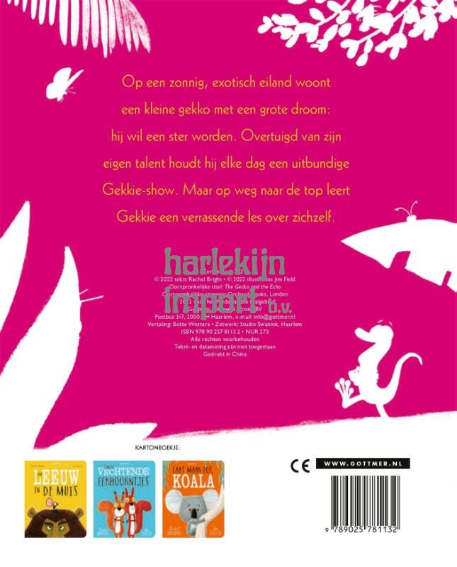 Deze kartonnen editie van het prentenboek 'Gekkie de gekko' is een tropische kleurexplosie! Bestsellerduo Rachel Bright en Jim Field hebben hun sporen dubbel en dwars verdiend met geliefde kinderboeken als 'De leeuw in de muis', 'Twee vechtende eekhoorntjes', 'Laat maar los, Koala' en 'Lars de dwarse dromedaris'. Elk prentenboek dat Bright en Field samen maken is een fabelachtig feestje vol kleur en muzikaal rijm. En ook dit verhaal heeft een subtiele boodschap: je krijgt wat je geeft. Gekkie de gekko wil niets liever dan een wereldster zijn. Op zijn exotische eiland houdt hij elke dag een grote Gekkie-show. Op een dag zijn de dieren het zat, maar Gekkie weigert te geloven dat hij geen ster is. Dan gaat hij liever weg! Hij vindt een grote kloof om in alle rust zijn lied te kwelen. Maar wat is dat voor afschuwelijk geluid dat daar terugkaatst? Na het succes van de kartonboekjes van 'De leeuw in de muis' en 'Laat maar los, Koala' is ook dit geliefde prentenboek van Bright en Field nu verkrijgbaar in een stevige kartoneditie. Ideaal voor de grijpgrage handjes van kinderen vanaf 3 jaar.