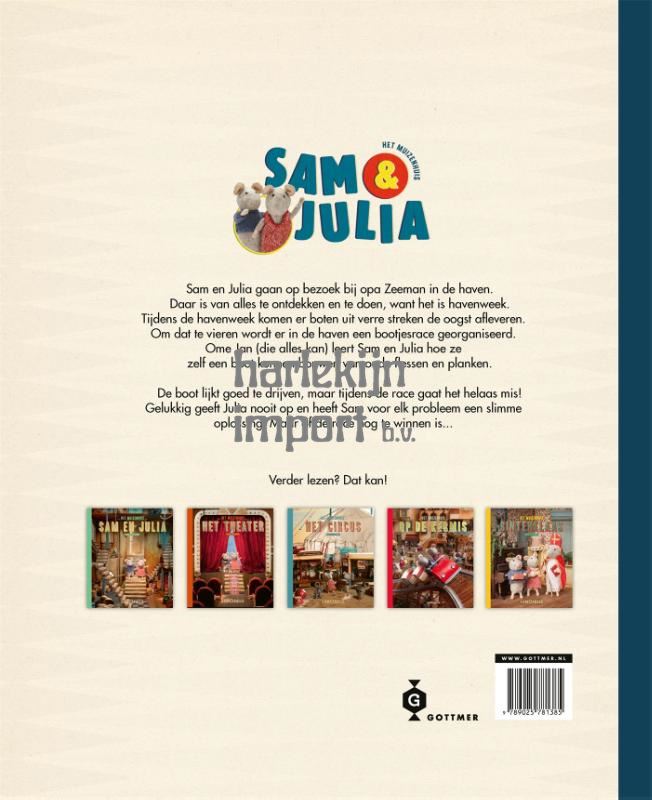 In het avontuurlijke vijfde deel uit de succesvolle prentenboekenreeks over Het Muizenhuis gaan Sam en Julia op bezoek bij opa Zeeman. In de haven is het een drukte van jewelste. Het is namelijk havenweek en daarom is er van alles te ontdekken en te doen, in én op het water. Tijdens de havenweek komen er boten uit verre streken de oogst afleveren. Om dat te vieren wordt er in de haven een bootjesrace georganiseerd - een race door de haven met allemaal zelfgebouwde boten. Ome Jan (die alles kan) leert Sam en Julia hoe ze zelf een boot kunnen bouwen van oude flessen en planken. De zelfgemaakte boot lijkt aanvankelijk goed te drijven, maar tijdens de race gaat het helaas mis. Zullen Sam en Julia de botenrace nog kunnen winnen...? De geschiedenis van het Muizenhuis begon met Karina Schaapman, een Nederlandse kinderboekenschrijfster en kunstenares. Zij startte in 2008 met geduld, precisie en een ongelooflijk oog voor detail met het bouwen van honderden bouwwerken vol huizen, winkels, straten en buitenruimtes op muizenmaat. Het Muizenhuis is volledig met de hand gemaakt van afvalmateriaal en vintage elementen en resulteerde in een reeks prachtige kinderboeken, waarvan 'Het Muizenhuis - Sam en Julia' het eerste deel was. Aan de hand van de boeken uit de Muizenhuis-reeks leer je steeds een nieuw stukje van de muizenwereld kennen.