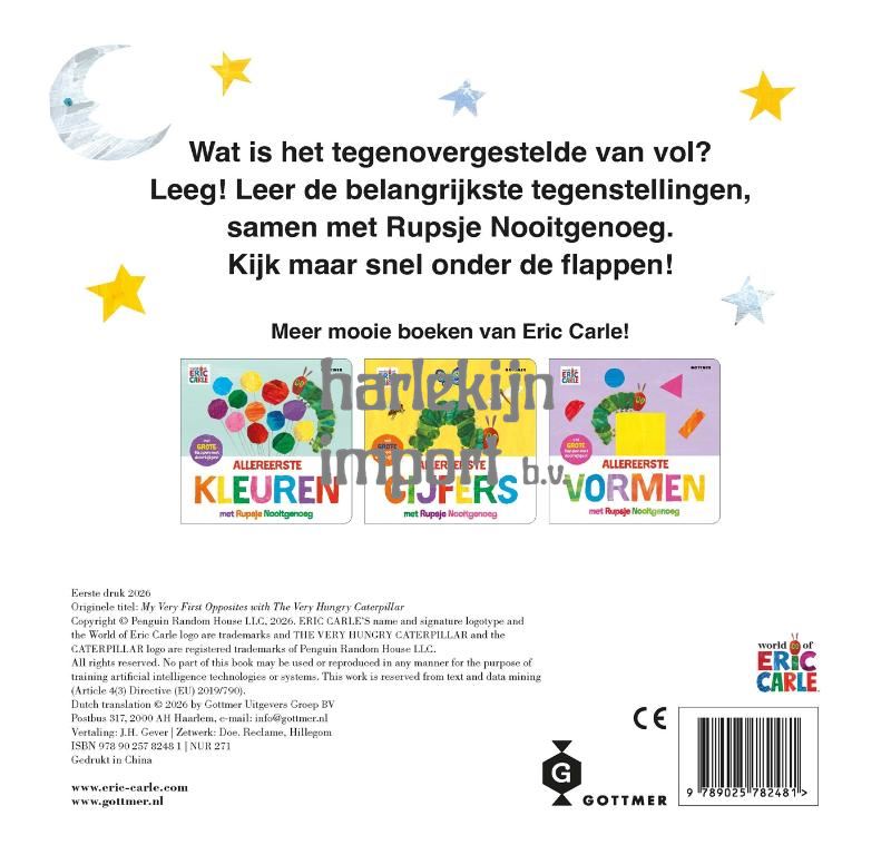 <p>In 'Allereerste tegenstellingen met Rupsje Nooitgenoeg' maken dreumesen en peuters op speelse wijze kennis met tegenstellingen. Groot en klein, licht en donker, vol en leeg: samen met het wereldberoemde rupsje van Eric Carle ontdekken jonge kinderen de verschillen om hen heen.<br><br>Dit stevige kartonboek voor kinderen vanaf 1 jaar sluit perfect aan bij de belevingswereld van de allerkleinsten. De herkenbare illustraties van Eric Carle en de eenvoudige woorden maken het boek ideaal om samen te kijken, aan te wijzen en te benoemen. Zo wordt spelenderwijs gewerkt aan de woordenschat en beginnende begripsontwikkeling.<br><br>'Allereerste tegenstellingen met Rupsje Nooitgenoeg' is een toegankelijk eerste leerboekje binnen de geliefde serie allereerste-boeken van Rupsje Nooitgenoeg. Een onmisbaar voorlees- en kijkboek voor thuis, de kinderopvang of als kraamcadeau voor jonge gezinnen.<br><br>Ook verkrijgbaar: 'Allereerste vormen met Rupsje Nooitgenoeg', 'Allereerste kleuren met Rupsje Nooitgenoeg' en 'Allereerste cijfers met Rupsje Nooitgenoeg'.</p>